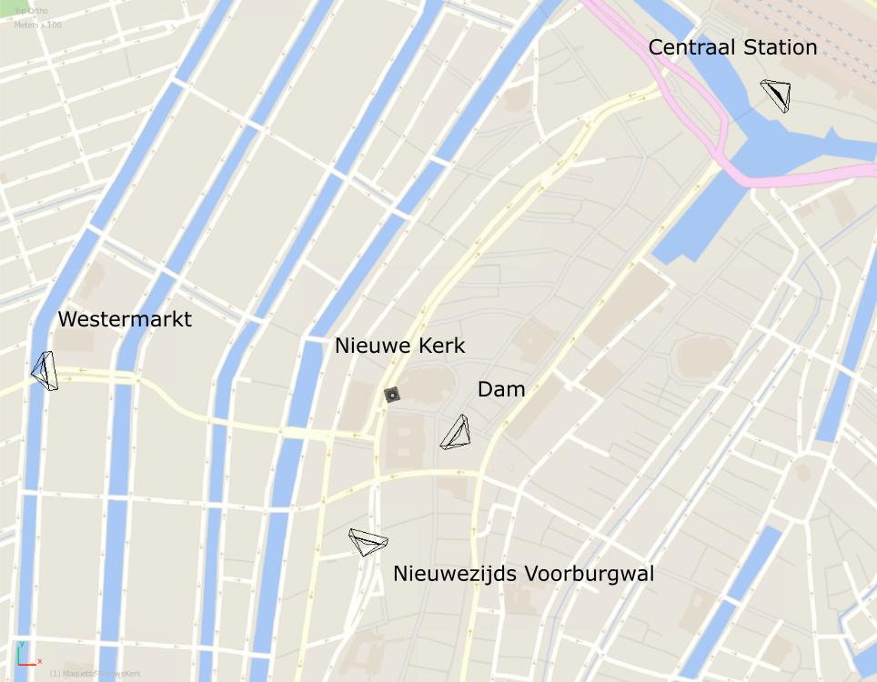 Ideally I would put the 3D model of the tower in a accurate 3D model of the city of Amsterdam, and render out the views. But constructing this model would take us far beyond the scope of this small sized project. So instead Gabri chose four viewpoints from which he wanted to look at the tower to gauge its visual impact. I prepared these viewpoints in a georeferenced map of Amsterdam loaded in 3D a modelling program, where I had also imported the scaled scale model of the tower. I decided position and angle of the camera, and the lens type in the 3D modelling software, and then went to the actual locations in the city centre to take matching photographs. I imported these back into the 3D modelling program, fine tuned the virtual camera positions and rotation, and rendered the tower from exactly these viewpoints. Also the sun position was chosen to match the date and time of the day on the photos. Finally, as the virtual and real world cameras were an exact match, the photos were simply overlain with the renders of the tower in a graphics program.